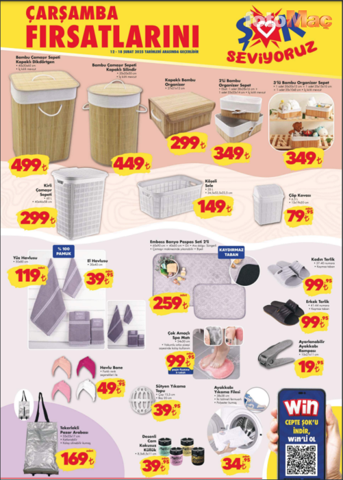 Bambu çamaşır sepetleri 499 TL’den başlayan fiyatlarla satışta. Sinbo ve Kreuzer marka dijital banyo baskülleri de indirimde. Ev ihtiyaçlarınıza uygun bu fırsatları kaçırmayın!